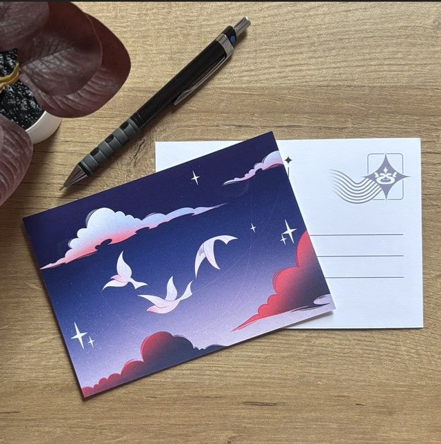Découvrez un voyage cosmique qui mêle rêve et aventure, une carte prête à être envoyée.