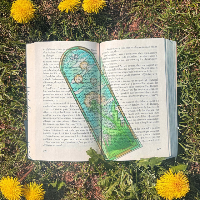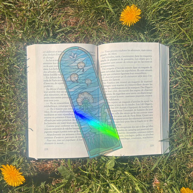 Un marque-page vitrail inspiré par la liberté du pissenlit. Une touche florale et lumineuse pour accompagner vos lectures.