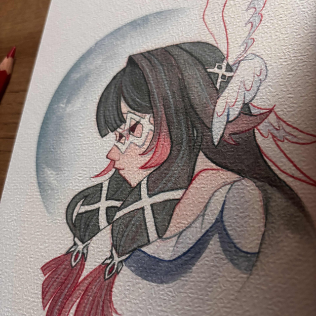 Réalisée à l’aquarelle et rehaussée de détails au crayon, cette création capture la douceur et le mystère du personnage.