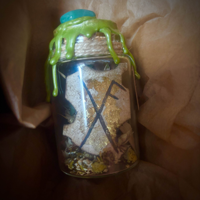 Fiole décorative contenant une rune de l’amour, réalisée sur un papier teinté au marc de café et ornée de feuille d’or.