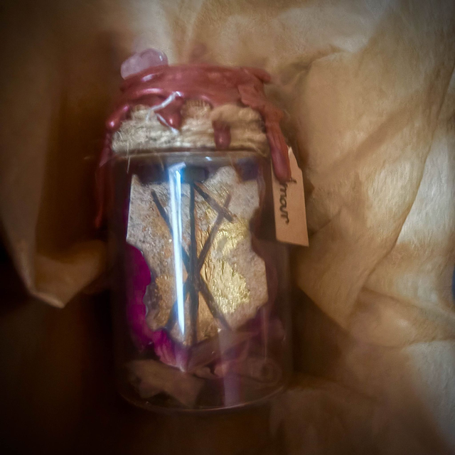 La fiole est scellée avec son sceau, et une pierre de quartz rose posée sur le dessus symbole de l'amour.